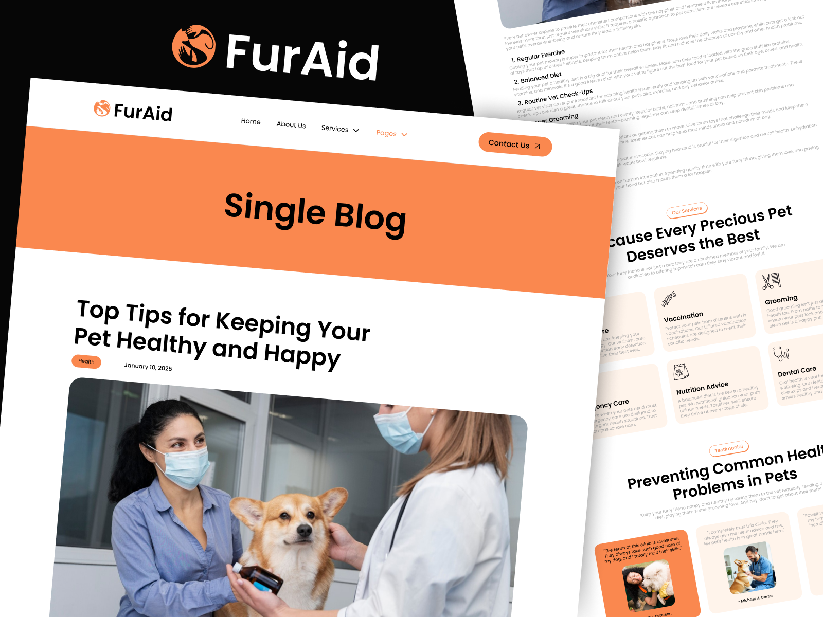 FurAid includes a range of professionally designed pages such as Home, About, Services, Team, Blog, and Contact — all optimized for mobile and desktop viewing. It also features integrated appointment booking sections, testimonial sliders, and service detail layouts to help you present your offerings with clarity and professionalism.