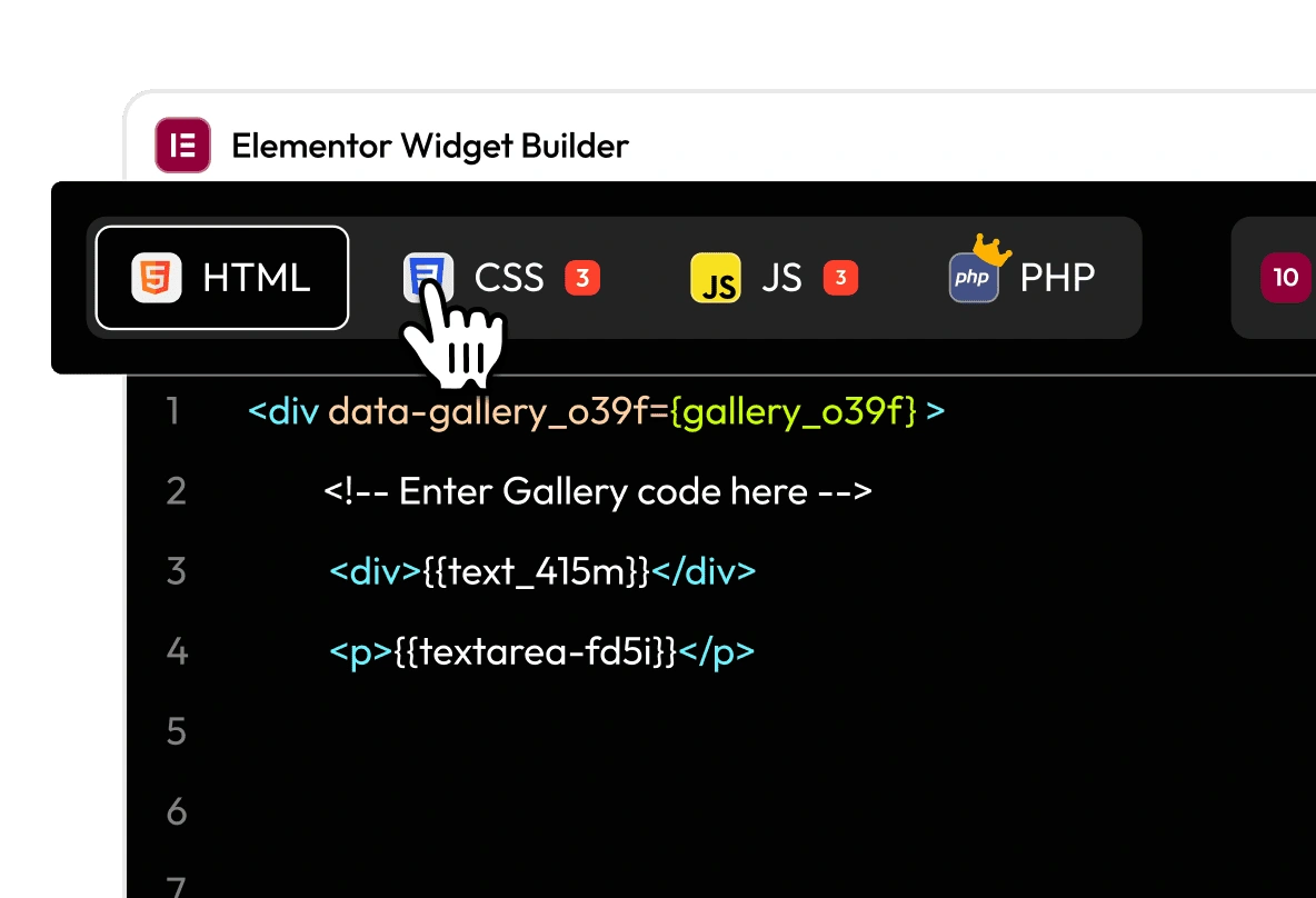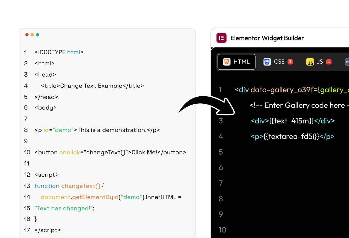 Convert HTML, CSS & JS to WidgetsWrite your logic once and turn it into a reusable Elementor widget with cloud sync and visual controls for every setting.