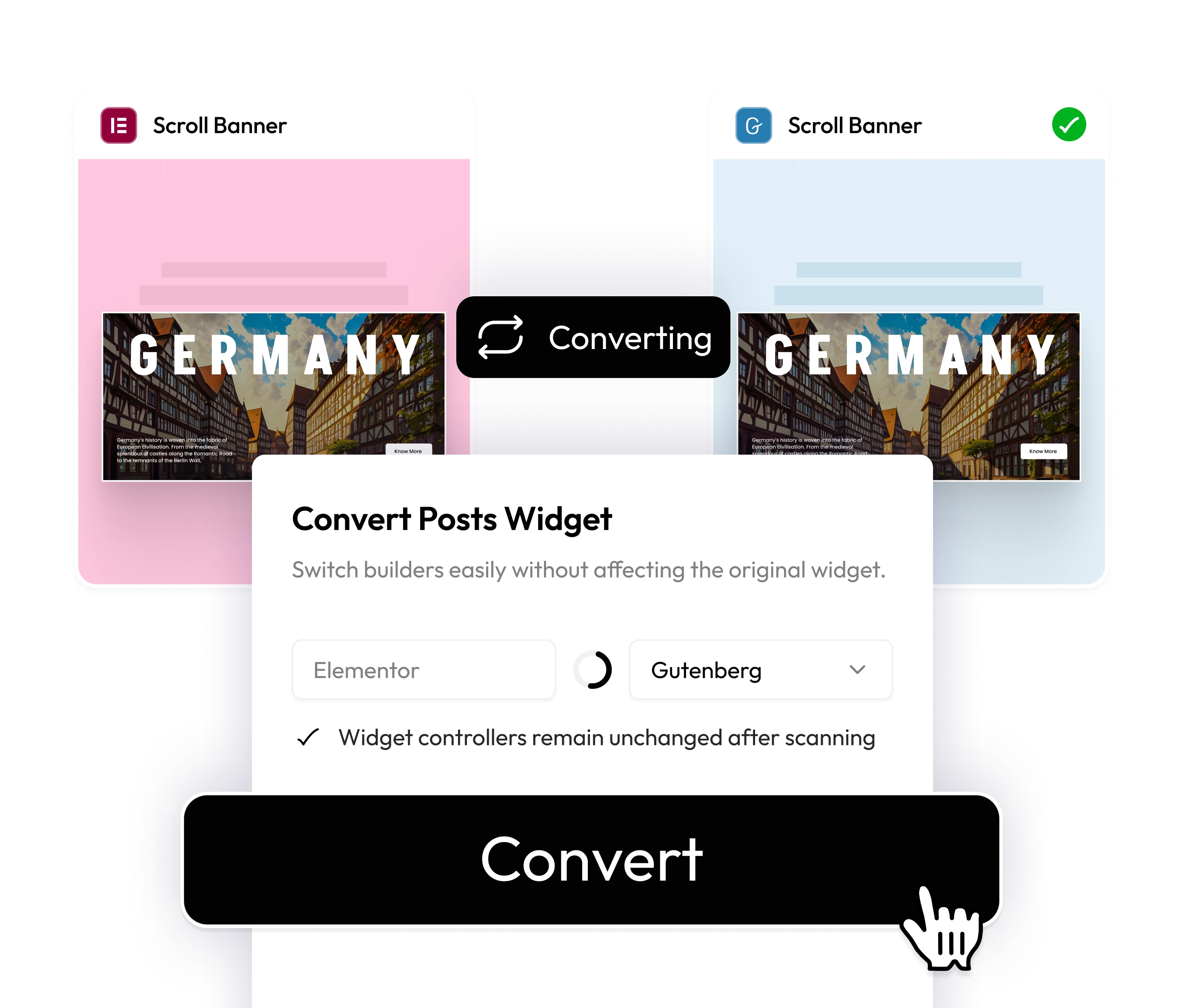One Widget, Multiple BuildersCreate once and convert your widget across Elementor, Gutenberg, or Bricks in seconds.